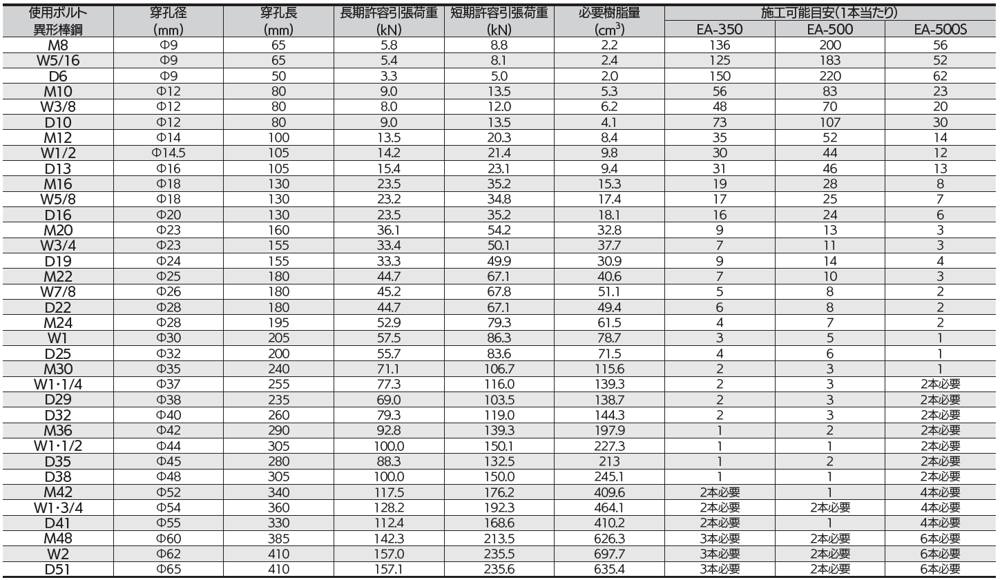 ※必要樹脂量は約20%の余剰を見込んでいます。 ※カートリッジ1本当たりの施工本数は目安です。 ※穿孔長は、4d(呼び径の4倍)~20d(呼び径の20倍)の範囲で対応可能です。