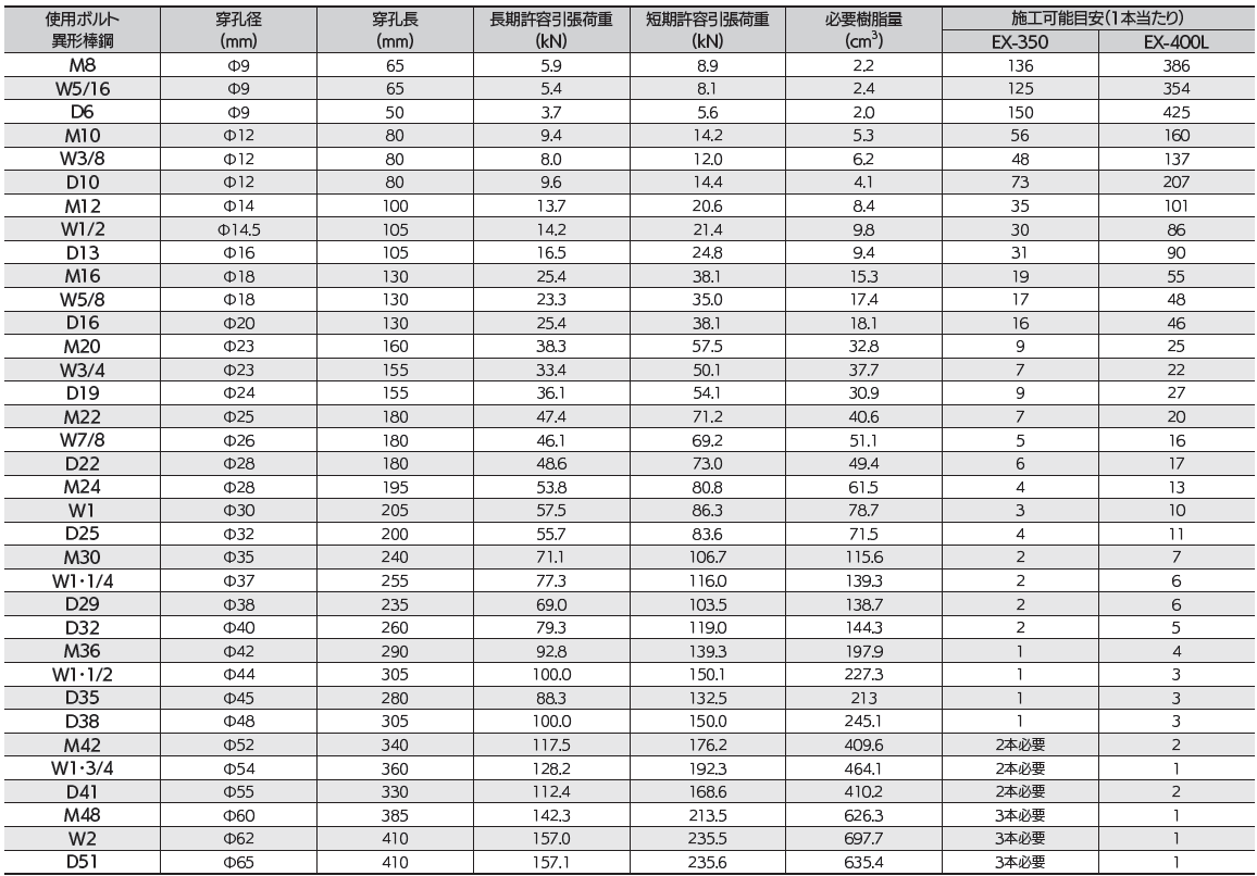 ※必要樹脂量は約20%の余剰を見込んでいます。 ※カートリッジ1本当たりの施工本数は目安です。 ※穿孔長は、4d(呼び径の4倍)~20d(呼び径の20倍)の範囲で対応可能です。